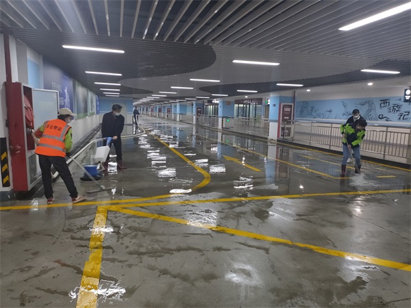 ? ? ? 為全面提升綜合客運樞紐停車場“五一”節(jié)前現(xiàn)場環(huán)境衛(wèi)生,為廣大旅客提供干凈整潔的出行環(huán)境。4月29日晚,在連云港站******一列火車運營下客結(jié)束后,豐達物業(yè)管理公司組織了10名員工,對客運樞紐地下停車場出租車道、社會車道等主要通道的地面痰跡、污跡、頑跡等進行了全面清理,清理面積近3500平米。