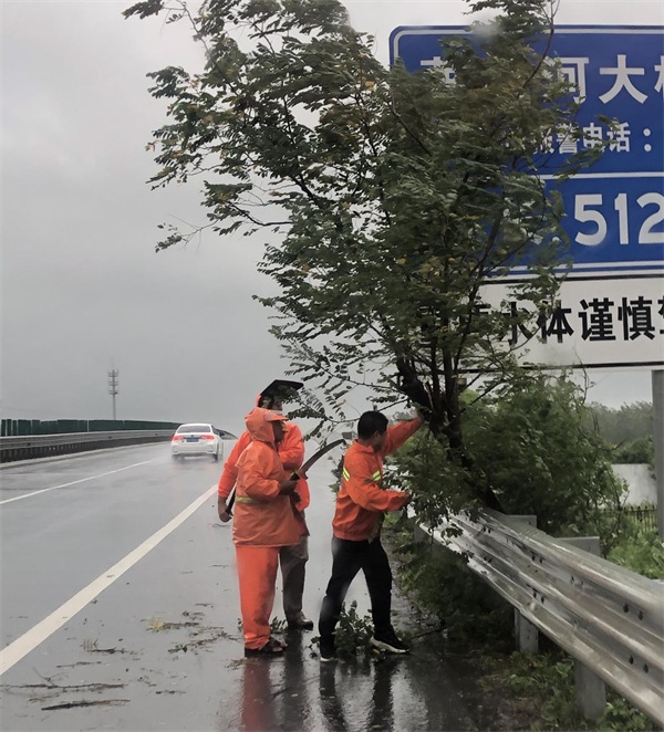 由于“煙花”臺風(fēng)影響,公司管養(yǎng)道路發(fā)生多處路樹倒伏,橙色突擊隊?wèi)?yīng)急搶修人員發(fā)揮連續(xù)作戰(zhàn)精神,無懼風(fēng)雨,連夜趕赴現(xiàn)場,迅速清理倒伏樹木,確保路面暢通。對于地勢低洼路段積水嚴(yán)重情況,養(yǎng)護(hù)應(yīng)急人員火速將抽水泵運到現(xiàn)場,開足馬力抽水排水,同時及時疏通排水溝、涵洞,搶抓時間及時修補(bǔ)路面坑塘,第一時間消除道路安全隱患,確保公司管養(yǎng)道路安全暢通。