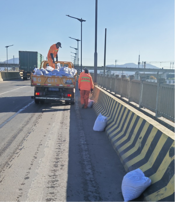 公司進一步完善了除雪防滑保暢預(yù)案,結(jié)合實際開展了除雪防滑應(yīng)急演練。對除雪機械設(shè)備進行了全面系統(tǒng)的保養(yǎng)和維護,儲備了融雪劑700余噸、防滑混合料300余噸,并在沿線橋梁、匝道、急轉(zhuǎn)彎等易滑易結(jié)冰路段放置了防滑砂和石子等混合料。同時,安排專人時刻關(guān)注氣象變化,及時掌握氣象信息,一旦出現(xiàn)降雪天氣,隨時出動人員和設(shè)備清障除雪。