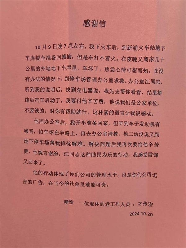 在10月9日晚7點(diǎn)左右,齊先生到綜合客運(yùn)樞紐地下停車場(chǎng)提車準(zhǔn)備回贛榆,但車打不著火,向停車場(chǎng)管理辦公室求救,公司職工江波立即伸出援手,不但幫助齊先生車子發(fā)動(dòng)成功,還幫助解決了車子其他問(wèn)題,他不求回報(bào)的熱心舉動(dòng)溫暖了齊先生的回家之路。