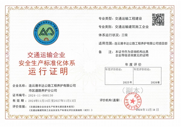 近日,豐達(dá)公司市區(qū)道路養(yǎng)護(hù)分公司順利通過江蘇省交通運(yùn)輸協(xié)會認(rèn)定,被評為交通運(yùn)輸企業(yè)安全生產(chǎn)標(biāo)準(zhǔn)化建設(shè)三級企業(yè)。